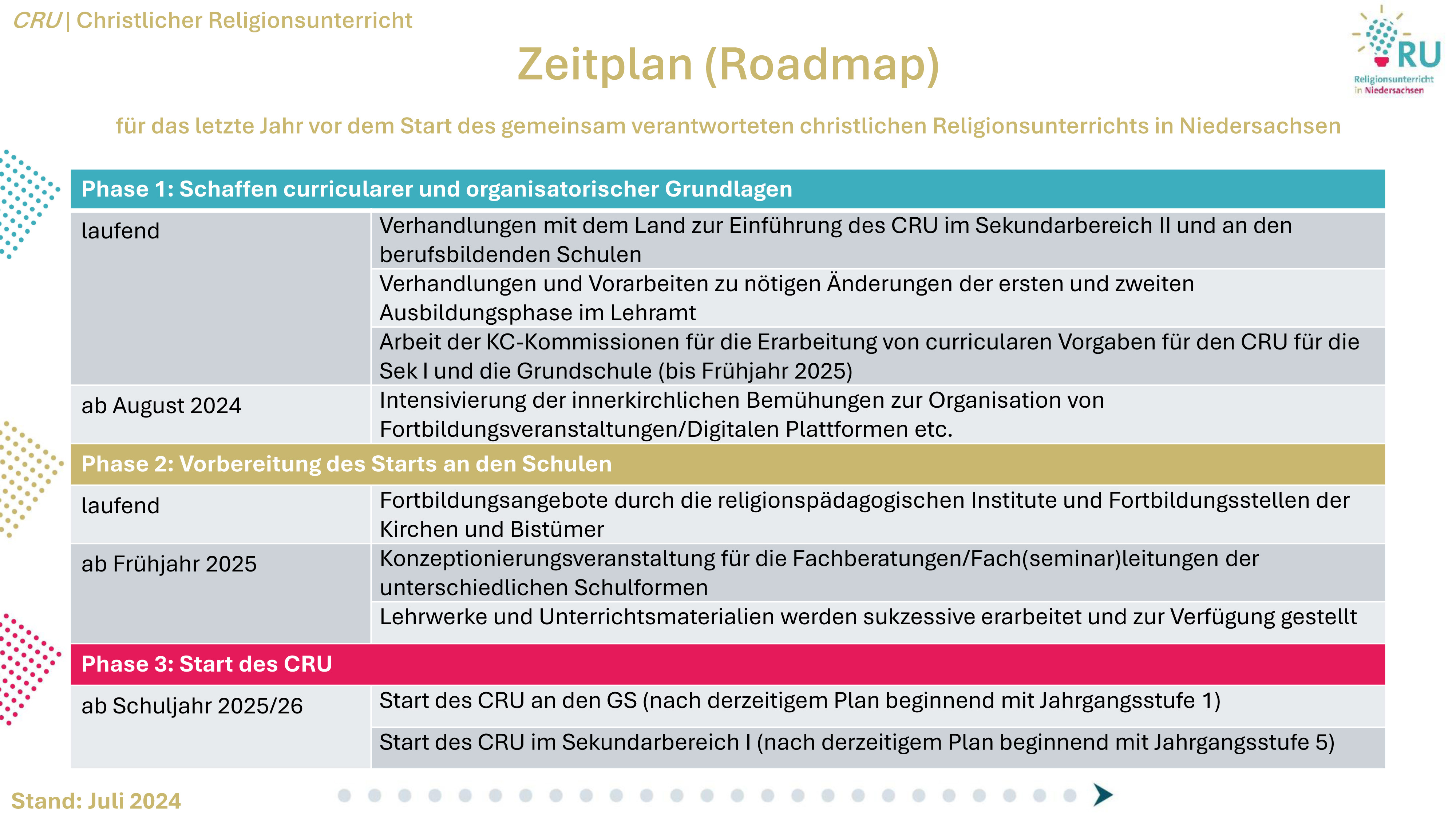 Seit rund zweieinhalb Jahren bereiteten Arbeitsgruppen der Kirchen und des Landes die curricularen und organisatorischer Grundlagen für die Einführung des neuen Fachs vor und erarbeiten Fortbildungs- und Konzeptionierungsangebote. Die Kerncurricula für das neue Fach Christliche Religion in der Primarstufe und in der Sekundarstufe I befinden sich aktuell in der öffentlichen Anhörung und sollen im Herbst dieses Jahres fertiggestellt werden. Danach können die Schulen sie erproben und die schuleigenen Curricula erarbeiten. Die Kommission zur Erarbeitung der Rahmenrichtlinien für das Fach an den berufsbildenden Schulen nimmt in diesen Tagen ihre Arbeit auf.
